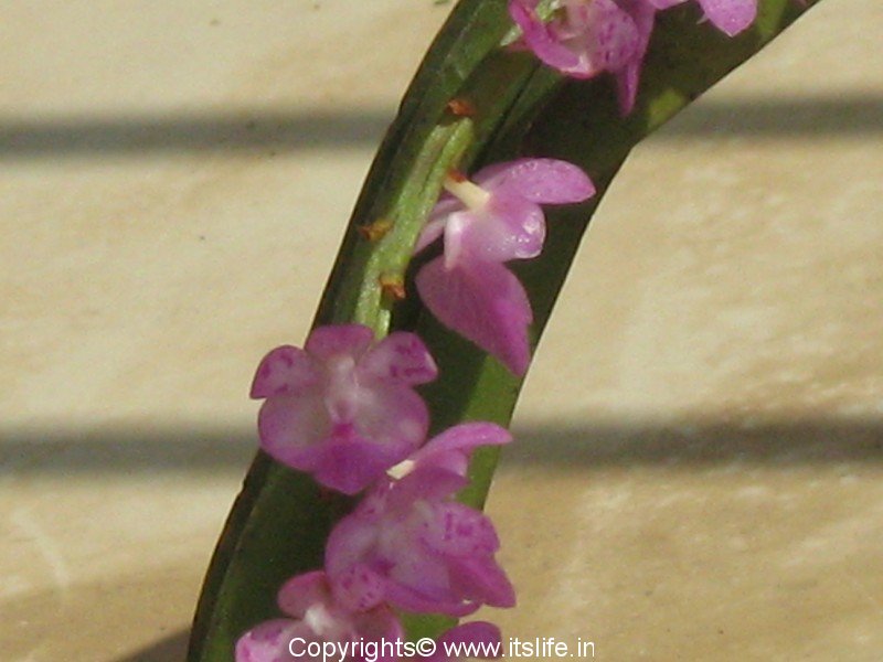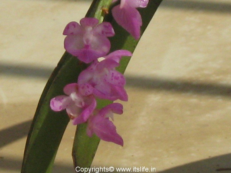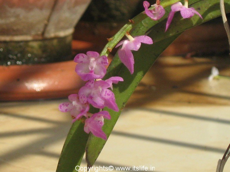 Ascocentrum is miniature Vanda-like plant found in the wild in the Himalayan foothills, Sikkim, Assam and Nepal at altitudes up to 1000 meters above sea level. The leaves are dark green with dark purple pinkish shades over them and are 10 cm long. The leaves are thick and tough looking arranged over one another.
