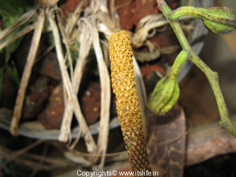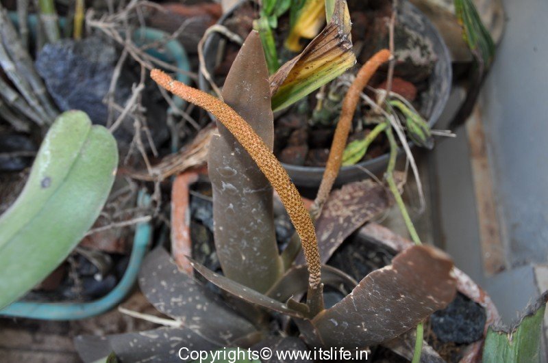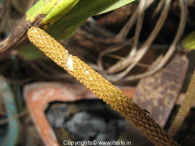 The flower spike is up to 11cm long and dozens of tiny flowers encircle the spike. The flowers are 1.5 mm in size.