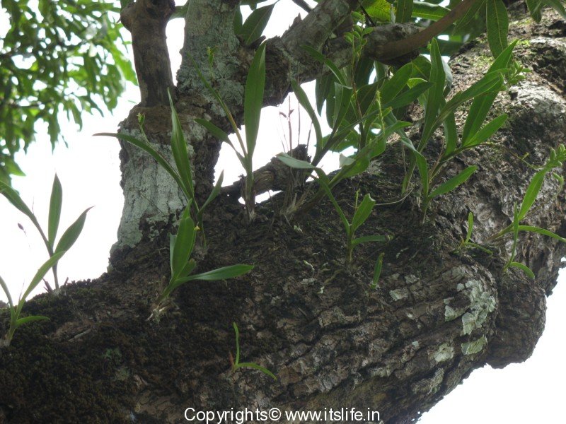 I saw a dense group of Orchid Polystachya Concreta growing on a thick branch of a tree that was covered with moss in Sirsi region.
