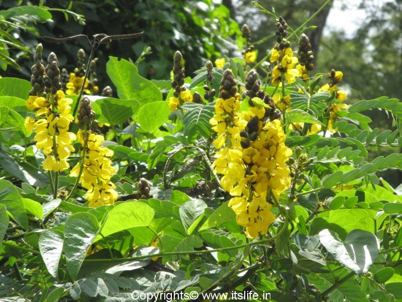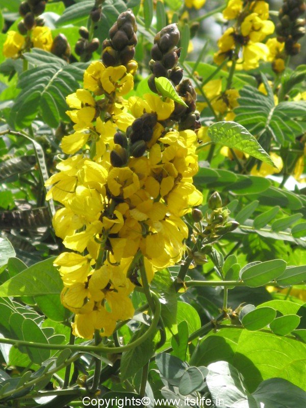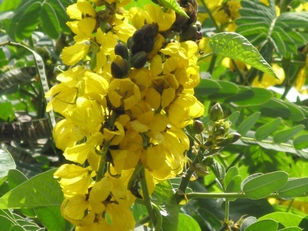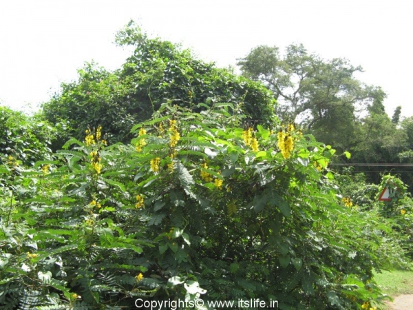 The leaves of this plant are large, evergreen, with compound leaves. The leaves are up to 3 feet in length and fold together in the night. The sulphur caterpillars find the leaves of this plant delicious food. The flowers bloom throughout the year. The flower buds are covered with brown bracts, which fall off when the flower blooms. The flowers attract butterflies, bees and small birds like flower pecker, sun birds and humming birds.