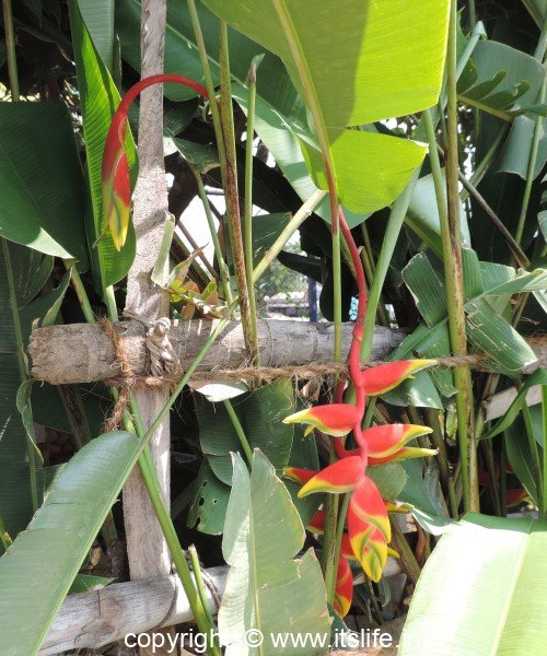 They grow upright with the flower stems in the center. The flowers face downwards. The pendant inflorescence bracts are red with greenish yellow edges. Each bract resembles a Lobster’s claw. The inflorescence length can be 3 feet long. The flowers last a long time and is best used in cut flower arrangement.