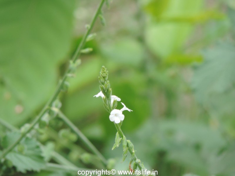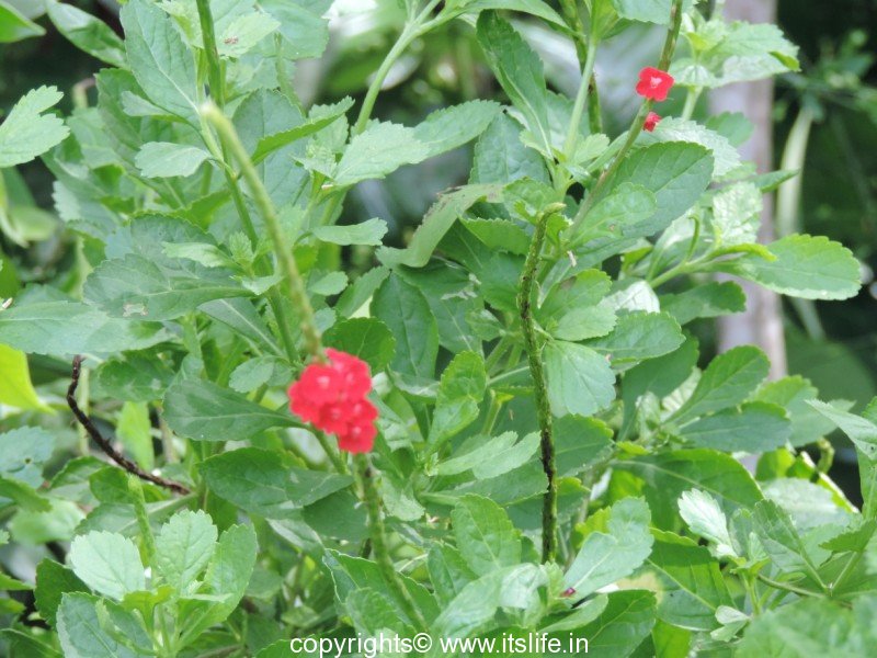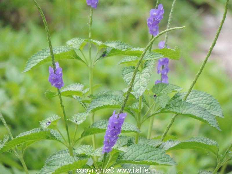 Common names are Blue porterweed, Blue snakeweed, and Brazilian tea. In Kannada it is known as Kariuttarani. Botanical name is Stachytarpheta jamaicensis and belongs to Verbenaceae (Verbena) family.