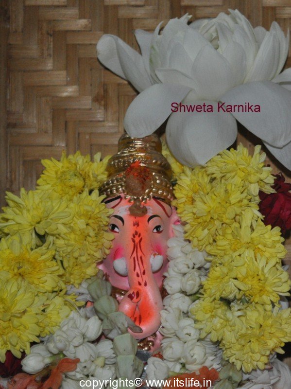 White or pink Lotus is offered to Lord Ganesha during the 21 Pushpa pooja, while chanting the following:
