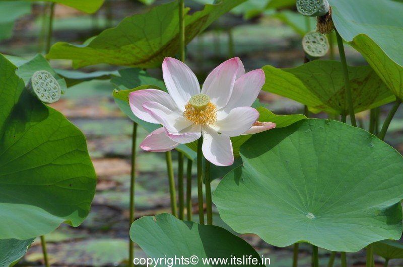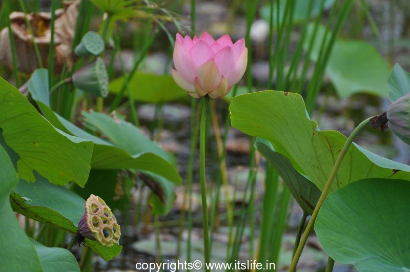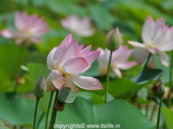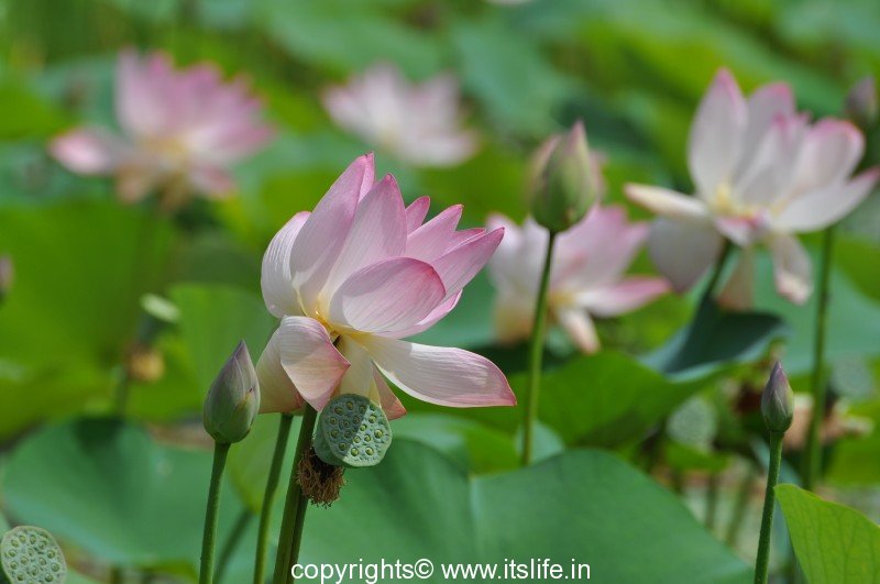 The seeds fall off into the water and get embedded in the lake bed to sprout into new lotus plants. The plant spreads to a large area in suitable conditions.