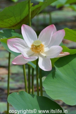 Lotus flowers bloom on thick stems that rise several feet above the water. The leaves are large, either oval or round in shape covered with miniscule hairs. The diameter of the leaves can be up to 2 feet. The flower can be as big as 10 to 12 inches wide in full bloom. Once the flower wilts, the triangular seed pod is exposed.