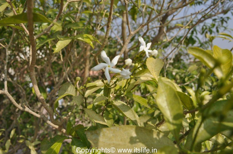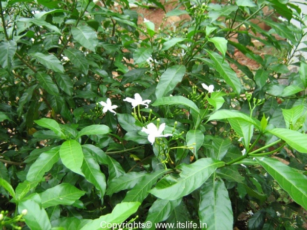 It is an evergreen shrub and is cultivated as an ornamental plant for its fragrant white flowers. Crape Jasmine grows to a height of 8 to 15 feet with a spread of 6 feet or more. Pruning will help retain a particular shape of the plant. The leaves are waxy deep green with sheen and are about 3 to 6 inches long and 1 to 2 inches wide, ovate and pointed. The fruit is an orange-red pod.