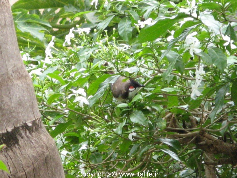 Picture – Red Whiskered Bulbul on a Nandi Battalu plant