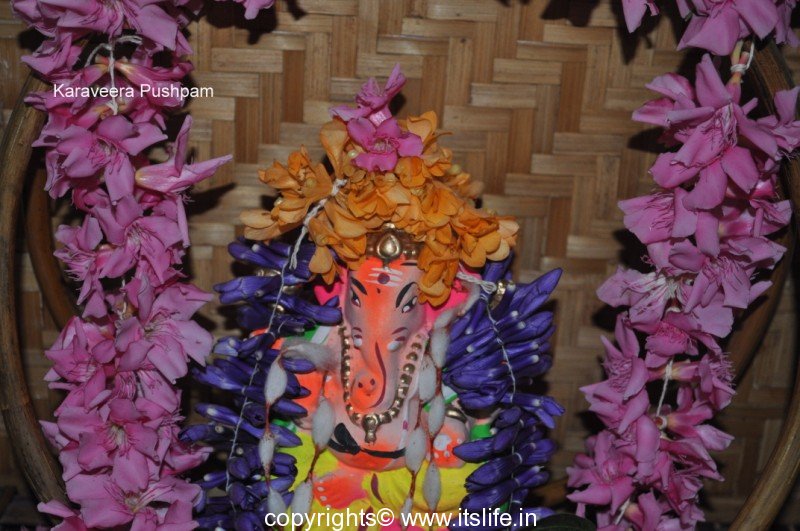 Oleander flower is offered to Lord Ganesha during the 21 Pushpa Pooja while chanting the below mantra: “Om Devaaneekarchithaya Namaha Karaveera Pushpam samarpayami”.