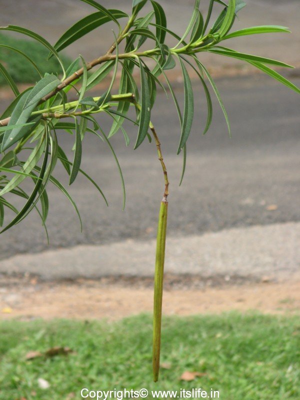 Botanical name of Kanagale (Kannada) is Nerium Oleander and belongs to family Apocynaceae. Oleander is an evergreen shrub which grows to 18 – 20 feet in height. The young branches are green and as they mature, the bark turns grey.