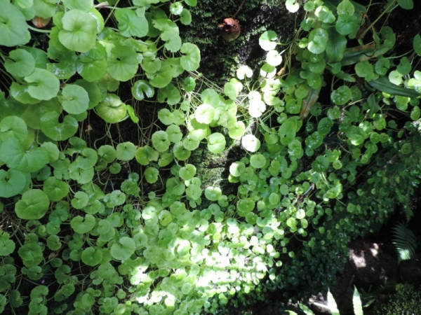 Due to the creeping nature of the plant, it is used as ground-cover in gardens. Bright green leaves are rounded around 2 inches long. The leaves look exactly like Brahmi (Pennywort).