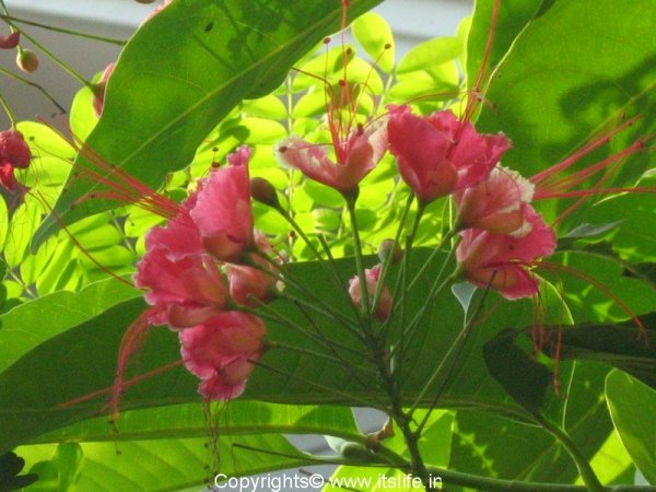The leaves and flowers of this plant resemble Gulmohar tree but the height of the plant grows up to 3 meters only. It is an evergreen plant and blooms throughout the year. The leaves are bi-pinnate, 20-40 cms long. Flowers appear in clusters with attractive long stamens and pistil up to 20 cms long.
