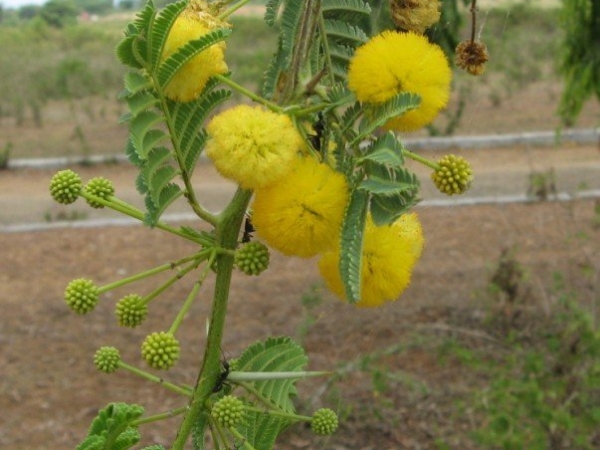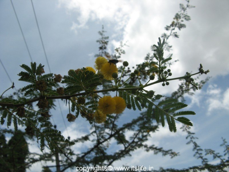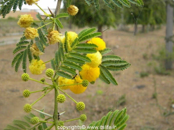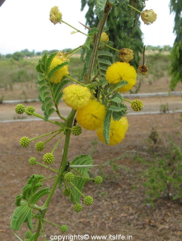 The other common names are Mimosa bush, Needle bush, Cassie flower, Fragrant acacia, Ironwood, Sweet acacia, and Sweet wattle. In Hindi it is known as Guh baboool, Gukikar, Gandh babool, in Kannada it is known as Kasturigibbali. Botanical name is Acacia farnesiana and belongs to Mimosaceae (Touch-me-not) family.