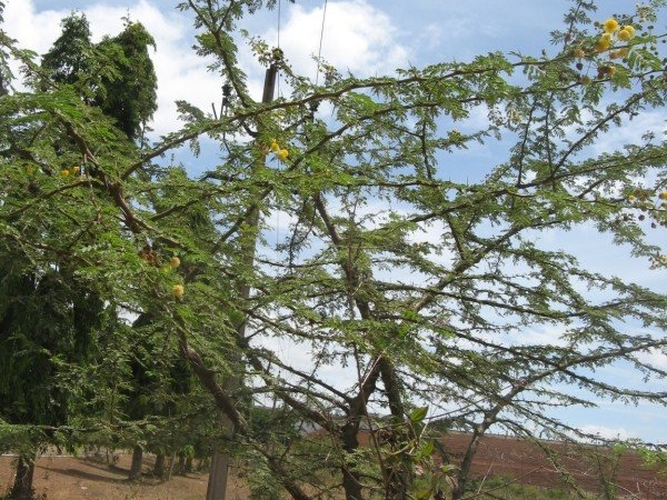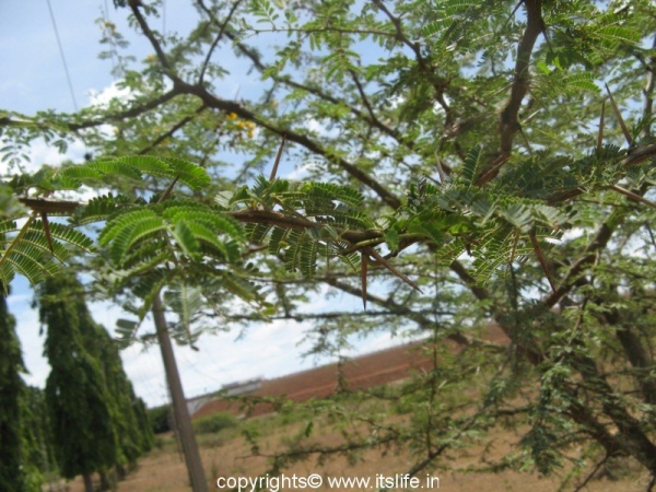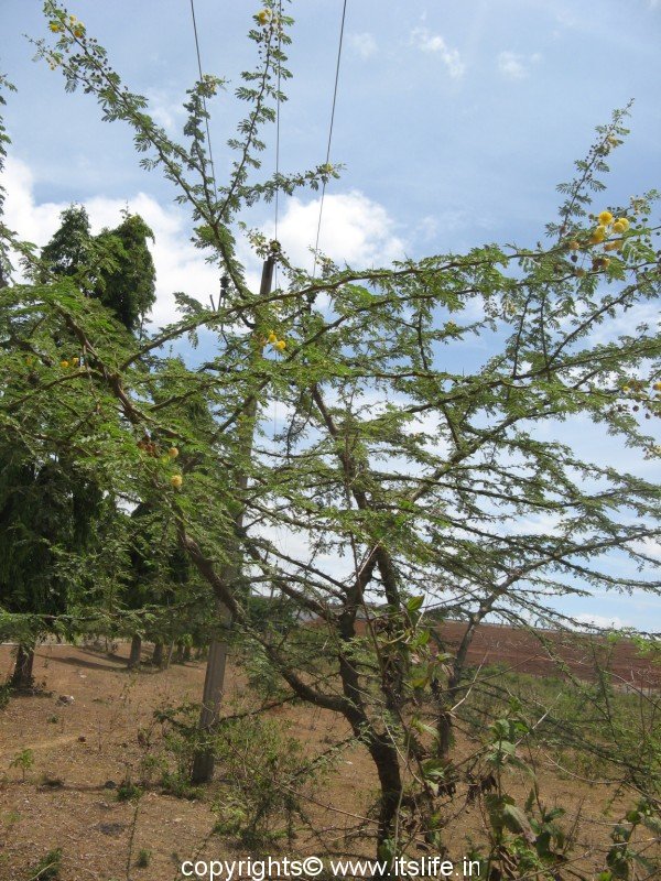 Yellow Mimosa tree grows to a height of 1.5 to 8 meters tall. Thorns are present all over the tree. The bark is rough, brown or grey. The tiny green compound leaves are alternate, pinnately divided leaves.