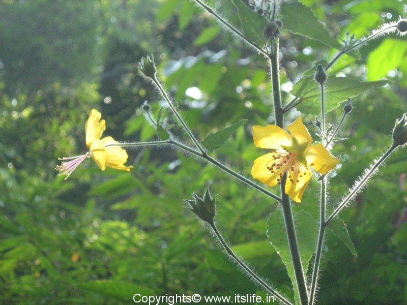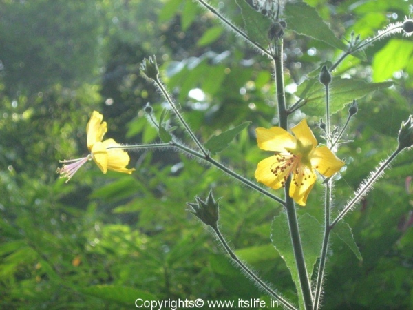I found this plant while trekking up to Iruppu falls. The plant grows to a height of 1 to 2 meters. The leaves are oblong, ipposite, toothed, smooth and covered with fine hair. The flowers are a beautiful golden yellow, 2.5 cms in diameter.