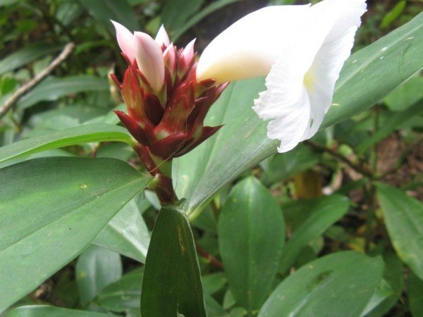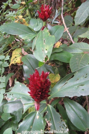 After the flower falls, the red cone bract remains intact adding color to the landscape. A variegated (double color leaves) version of the Crepe Ginger plant is also cultivated.