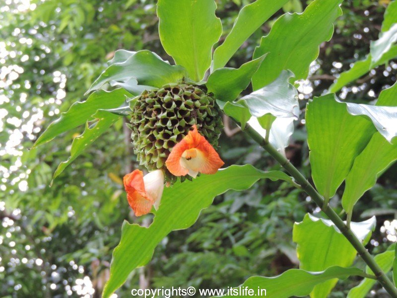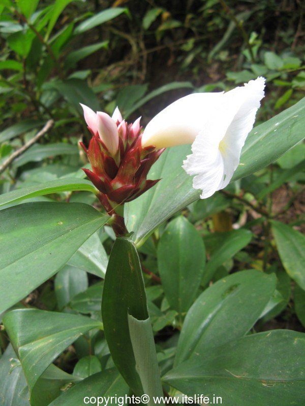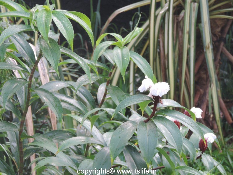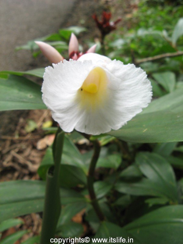 Flowering season starts from October to December. Crepe Ginger flower are white, yellow to orange and sometimes red and the waxy petals have a Crepe texture. They bloom on red cone-shaped bracts at the tip of the sturdy stems.