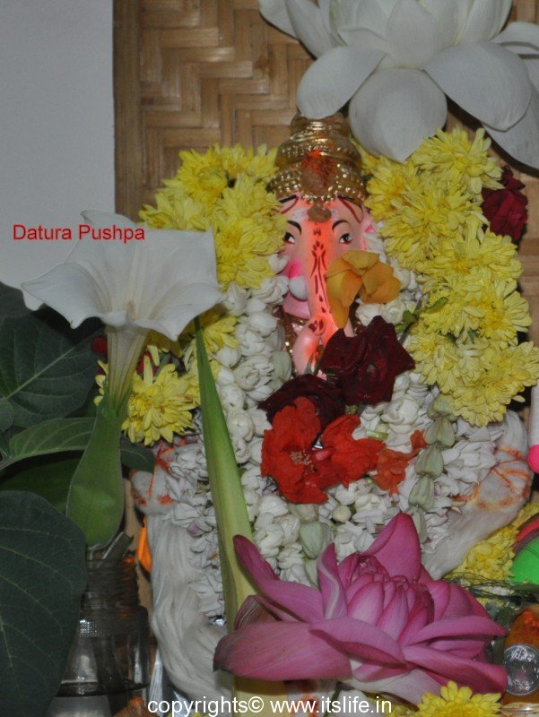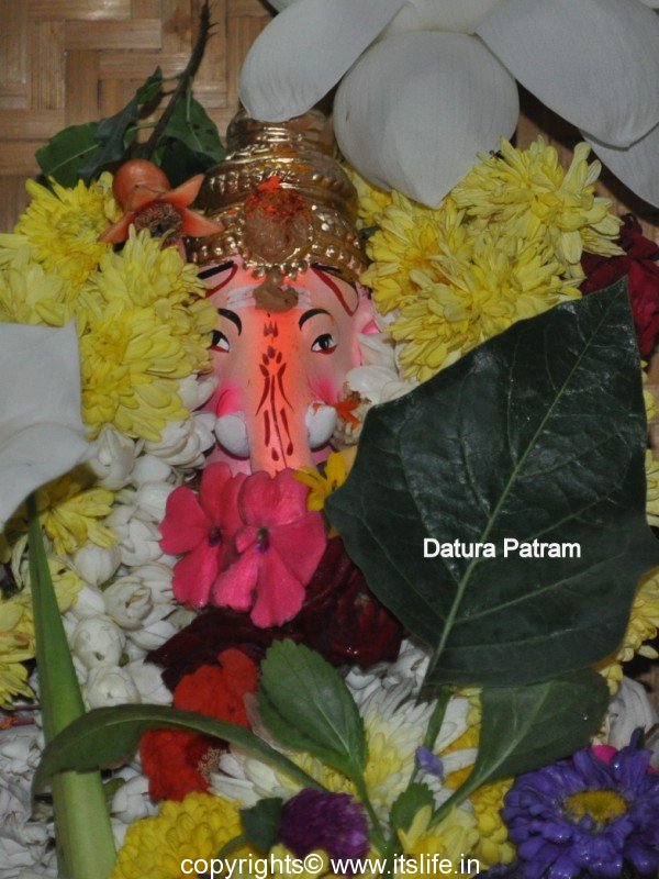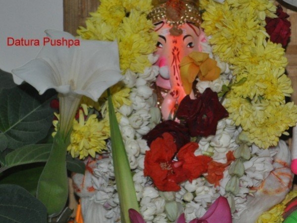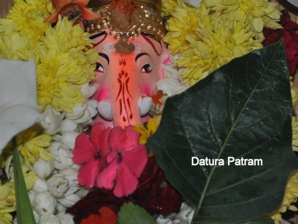The flowers are offered to Lord Ganesha during 21 Pushpa (flowers) Pooja. ” Om Indra Sripradaya Namaha, Duttura pushpam Samarpayami” is chanted while offering this leaf to the Lord.