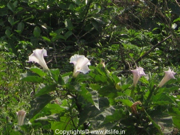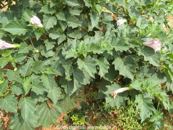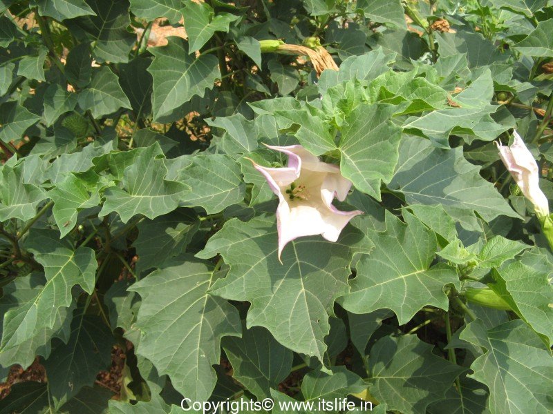 Datura is a herbaceous, woody, perennial shrub with erect flowers and grows wild in South India. They grow to a height of 3 feet.