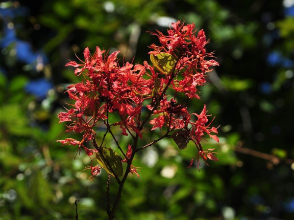 Flowers are red and bloom at the end of the branches. The stamens are very attractive and are longer than the scarlet red five petals.