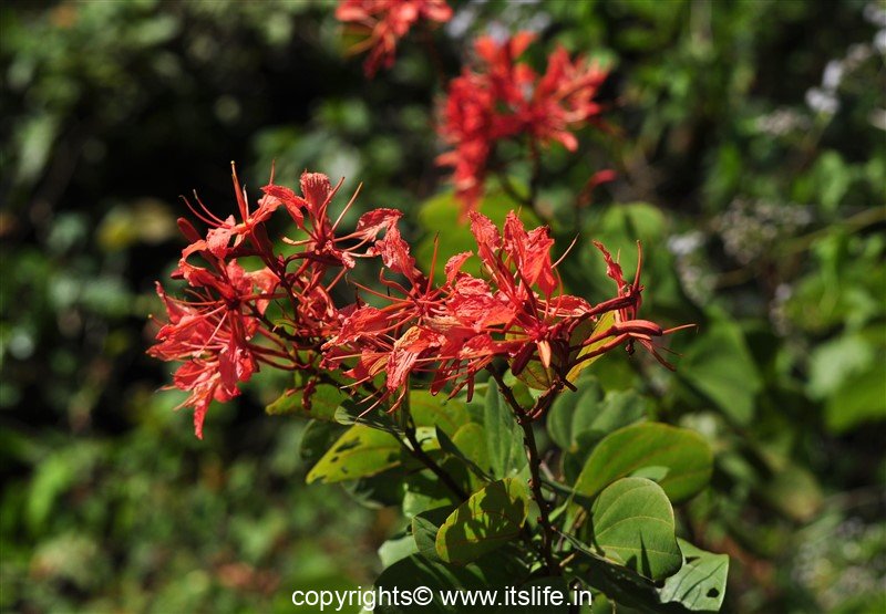 Scarlet Bauhinia is large climbing shrub endemic to the Western Ghats. Since it is fast growing, it can be seen growing tall and in bloom using the trees as support. The shrub blooms during January to February.