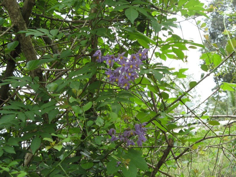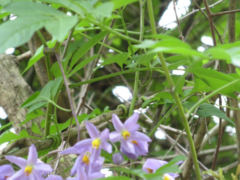 Solanum belongs to Solanceae family and is native to Europe and Asia where it grows fast and is invasive. It is perennial and grows to a height of 1 to 2 meters. The leaves are alternate and petiolate, typically 3 to 5 lobed. They are around 4 to 12 cm in length and are poisonous to humans. The flowers are loose clusters and each flower measured around 1 to 2 cm across. The five purple petals form a star shape and yellow stamens point forward. Though I could not see any fruits they are supposed to be oval in shape and red about 1cm long, soft and juice but very poisonous to humans and livestock. The fruits are liked by birds and are harmless to them.