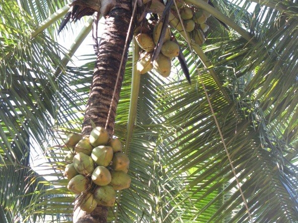 The fruit is green or orange with a calyx. Very small while young and grows to a size of a man’s head. Fiber covers a nut and as it matures, the nut when cracked open with have less water but more Coconut meat.