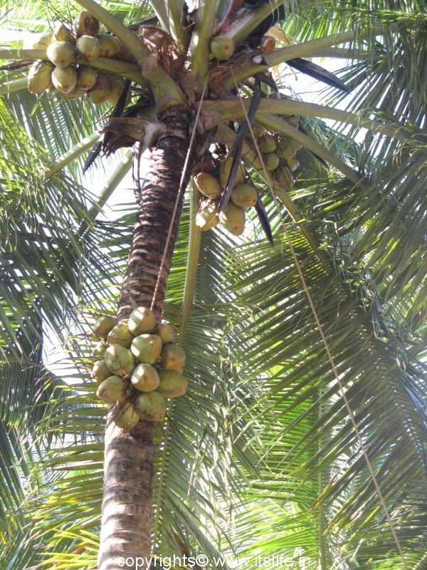 Coconut tree can grow up to 30 meters tall. Trunk is straight, greyish brown and smooth. The trunk has scars from fallen leaves. Leaves are green and pinnate and can be 4 to 6 meters long. The inflorescence contains both male and female flowers and start from the point whether the leaves are attached to the trunk.