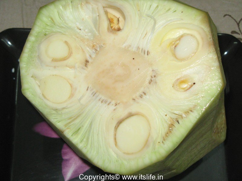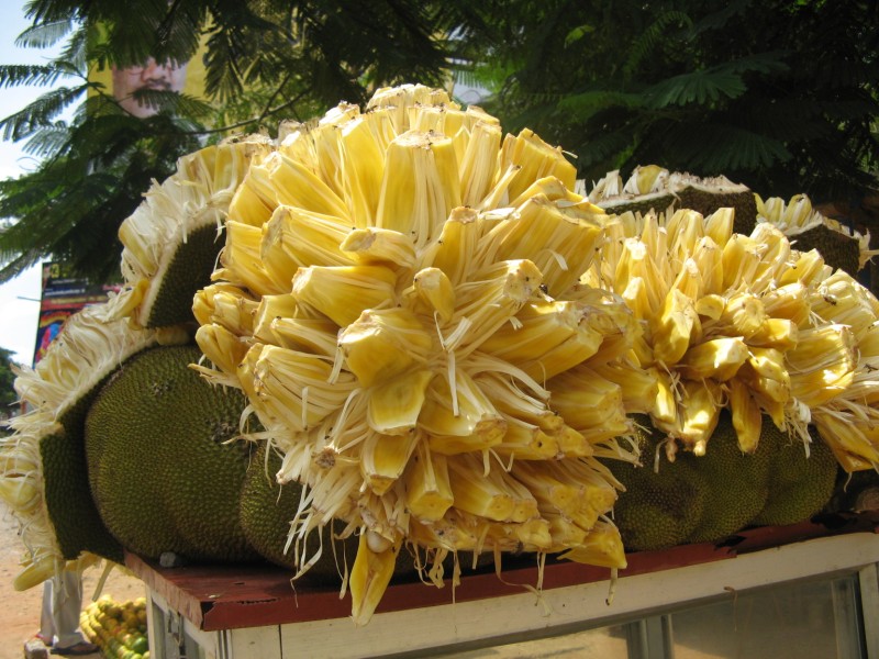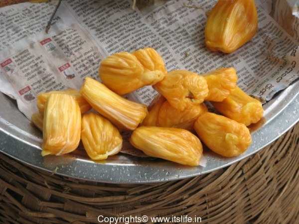 The name of the fruit originated from the Malayalam work “Jakka”, the Portuguese used this and appended the word fruit to it, so it was Jakkafruit and now it is known as Jackfruit. In Hindi it is known as Kathal and in Kannada as Halasina Hannu.