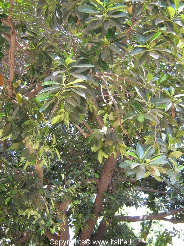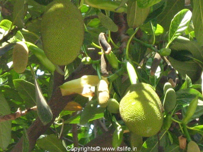 Jackfruit is the largest fruit grown on earth. It can weigh up to 36 Kgs, and grow up to 37 inches long and 20 inches in diameter. Many varieties of jackfruits are cultivated and the tree grows to a height of 70 feet. White latex is derived from all parts of the tree.The leaves are dark green, thick with rounded ends and grow in close clusters at the end of the branches. The leaves are used as a wrapping for steamed idlis.
