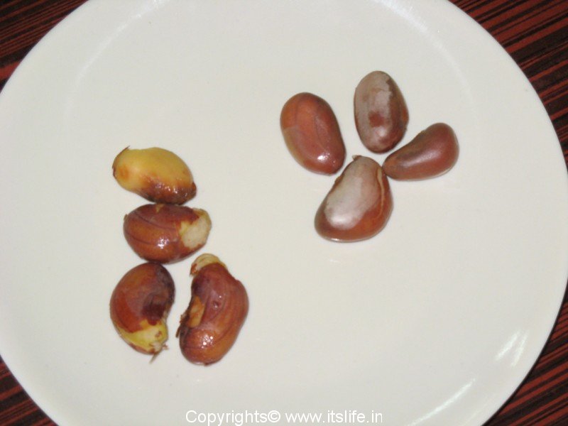The seeds of the fruit are smooth, oval, brown seed covered by a thin grey skin. The seeds are 2 to 4 cm long and 0.5 inch thick. The seeds when cooked are eaten as a snack.
