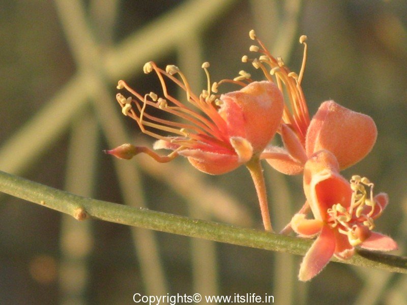 The botanical name of this tree is Cappari deciduas, which belongs to the family Capparaceae*. The plant grows to a height of 4 to 5 meters. Leaves are extremely small about 2mm, which goes unnoticed. The flowers are orange.