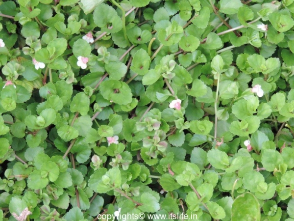 The leaves are green and round with veins. Around 2 cm in diameter they are solo at every node and hence the Kannada name Ondelaga (one leaf). The flowers are small around 3mm and bloom in single or in bunches, pinkish to red in color. The fruit is also small and ribbed.