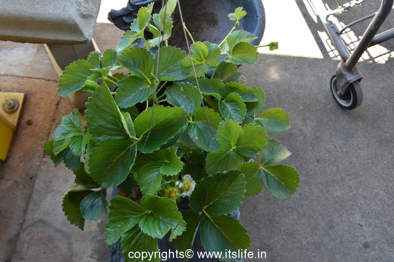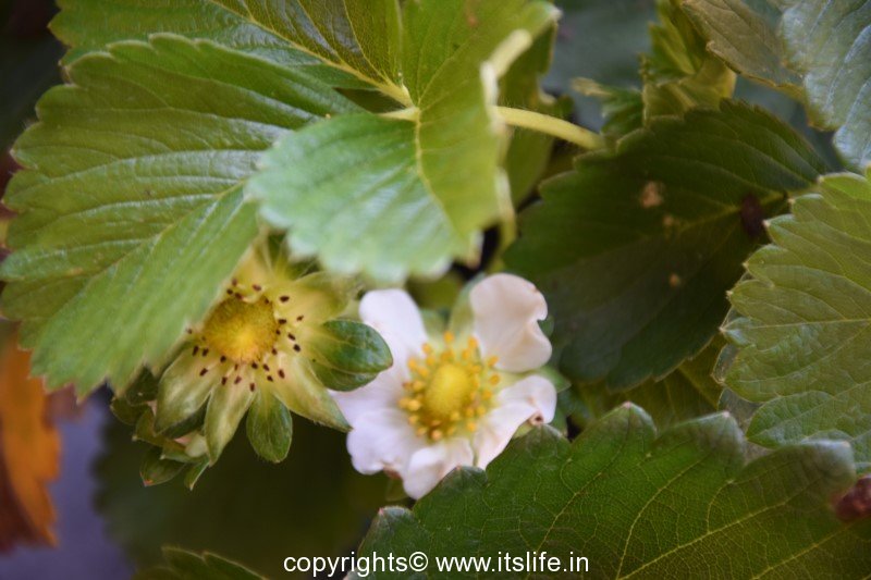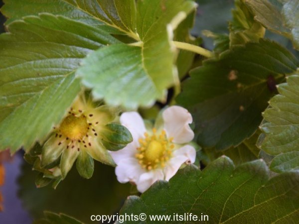 Every species of cultivated Strawberry has a different structure. But most of them are spreading and need support to grow well. The flowers are white with yellow center.