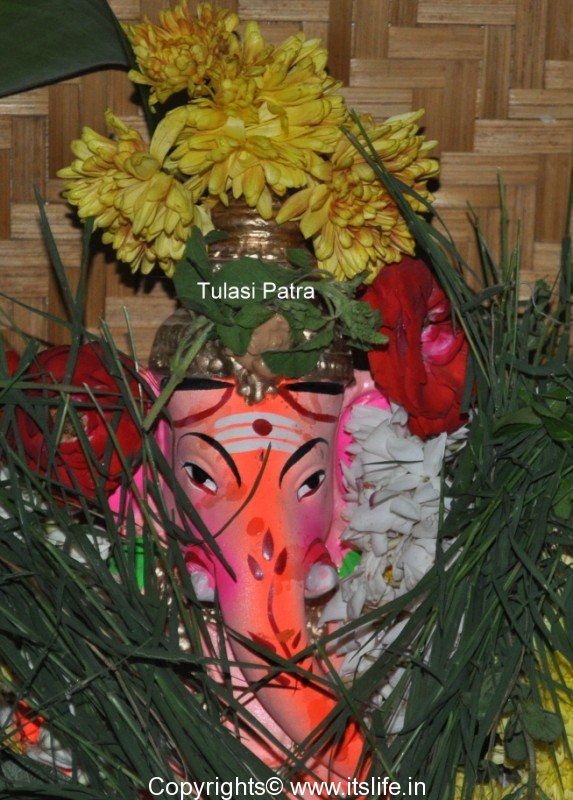 Tulasi is offered to Lord Ganesha during the 21 patra (leaves) pooja while chanting the below mantra: “Om Gajakarnaaya namaha, Tulasi Patram Samarpayaami”