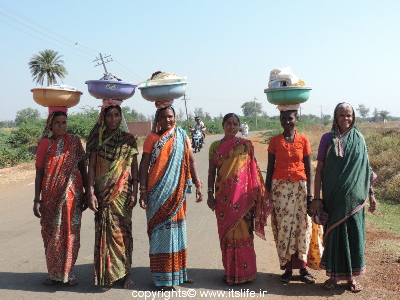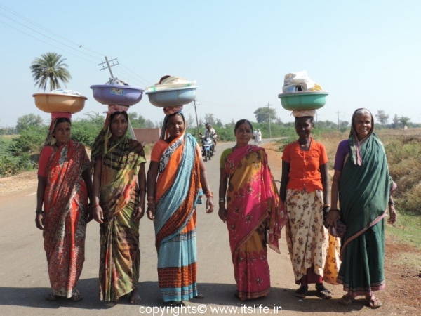 Women off to work to the fields on a sunny morning in Kurtakoti village.