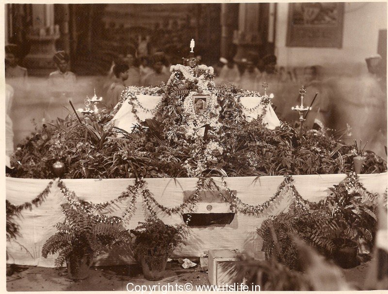 Picture – Ash urn of Mahatma Gandhiji kept at town hall Mysore 1948.