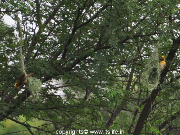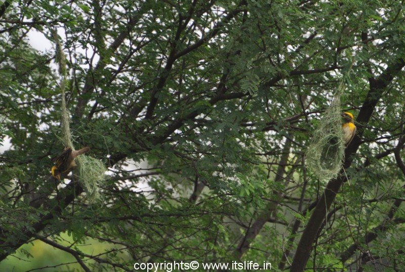 The baya weaver bird is found across the Indian Subcontinent and Southeast Asia. On one of our birding trips, we found flocks of these birds in the outskirts of Bangalore. The birds were very actively engaged in building the beautifully shaped hanging nests woven from leaves and twigs collected by the male bird.
