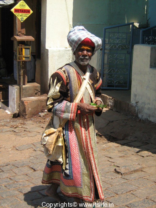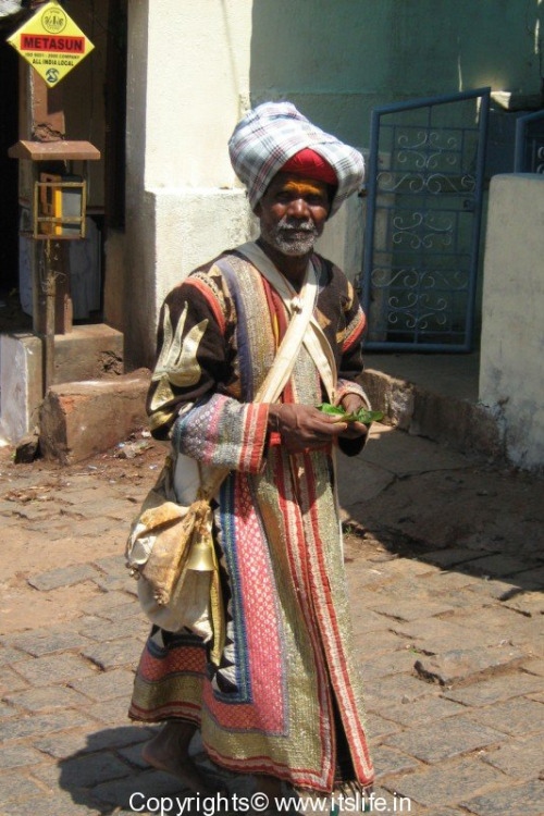 Goravas are followers of Lord Mailara / Shiva. Goravappas consider themselves the soldiers in service of Mailaralinga while he fought demons Mallasura and Manikasura. Goravappas are identified by their distinct nomadic lifestyle and attire , such as the generous smear of turmeric paste on the forehead, caps made of bearskin, kambal (black wool blanket sheets), black coat adorned with embroideries, cowries/shells and small sized bells, white dhoti, holding a Damaru and a pillangovi (shrill flute).