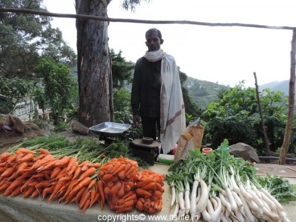 Our plan was to shop for some fresh vegetables in Kodiakanal before returning home. As we drove downhill, at the side of a road curve were fresh carrots and radish on sale! We sure stopped and shopped and the vegetable vendor was more than happy to pose for a picture.
