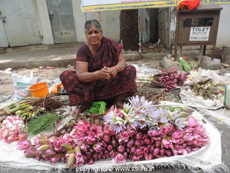 This lady selling beautiful Water Lilies appeared to be very satisfied with her job and also obliged to be photographed. Picture taken in front of Vinayagar Temple, Pondicherry.