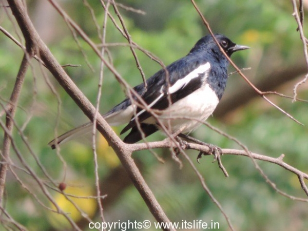 The Oriental Magpie-Robin (Copsychus saularis) is a small passerine bird considered as an Old World flycatcher. These birds are spotted in Indian Subcontinent and parts of Southeast Asia. They were favorite as pets as they were popular for their sing song calls. They are black and white birds with a long tail that is held upright as they forage on the ground or perch conspicuously. The Oriental Magpie-Robin is national bird for Bangladesh.