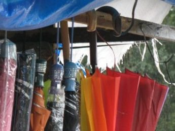 The shop at Banusara Dam, Wyanad, Kerala was selling these colorful umbrellas. I have observed that most of the coastal people use the umbrella tactically to stop the splash from puddles when vehicles pass over them.  Eventually they get drenched by rain as the umbrella goes quickly 90 degrees to the right of left to avoid the splash from vehicles.  But their argument is the rain water is better than the muddy water and I agree with them.  The versatile Umbrella!