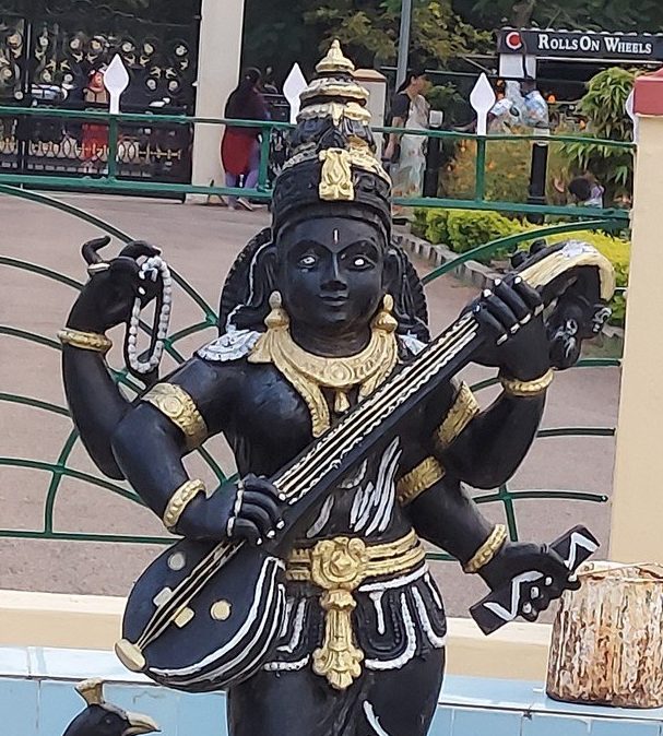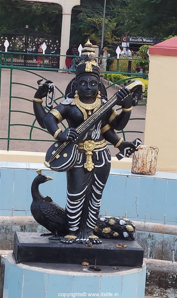 The above Saraswathi idol is installed in Javare Gowda Park in Saraswathipuram, Mysuru.