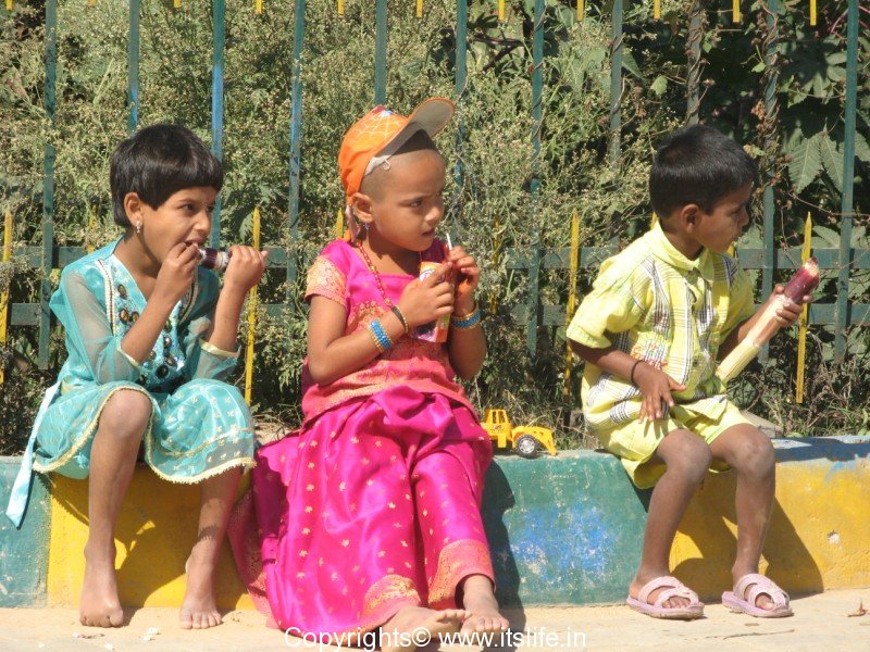 Here are kids dressed in new clothes on Shankranthi day enjoying biting into juicy sugarcane!