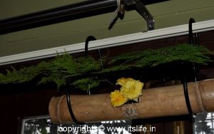 A flower arrangement hanging in the air gives a sense of freedom to the room.