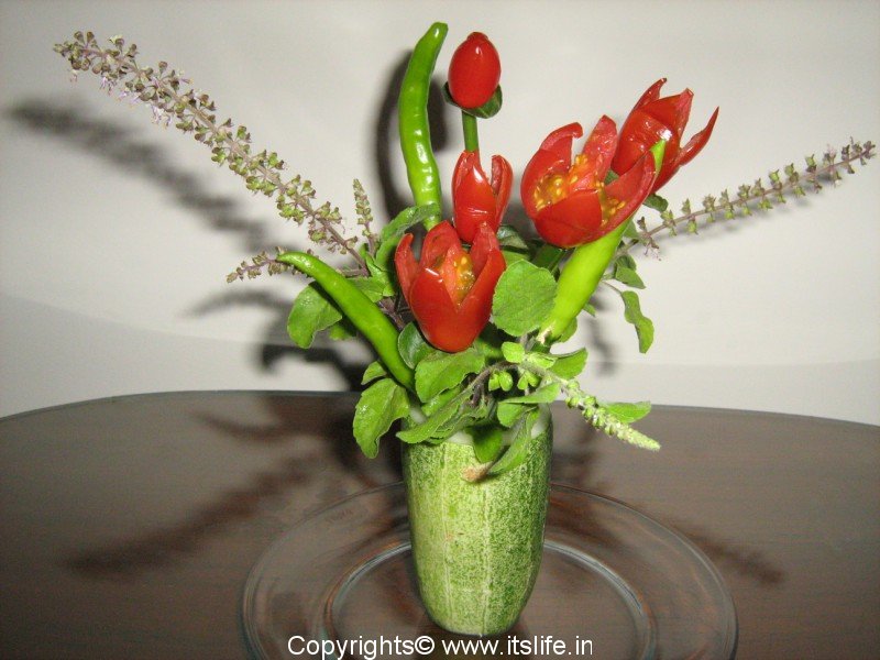 Cherry tomatoes carved into flowers and arranged in a Cucumber vase. Materials Required: 5 - 6 Cherry Tomatoes 10 Sticks…