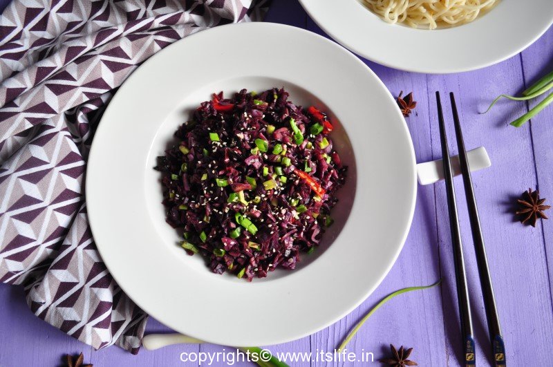 This is a simple stir-fry dish using purple cabbage. You can serve with either Rice or Noodles.