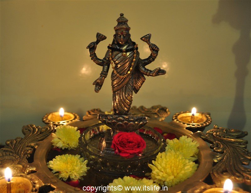 Items Required: Camphor or Cotton Wicks soaked in Ghee Aarathi Plate Flower Petals and Manthrakshathe (Rice smeared with Ghee and…