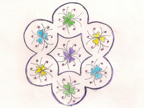 Butterfly Rangoli Method: Dot 13 – 7 Middle Join the dots as shown in the picture.
