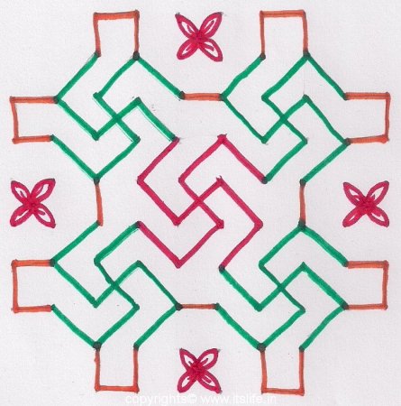 Swastik is an auspicious symbol in Hindu religion. Here is a Rangoli of Swastiks. Method: Dots 10 by 6 –…
